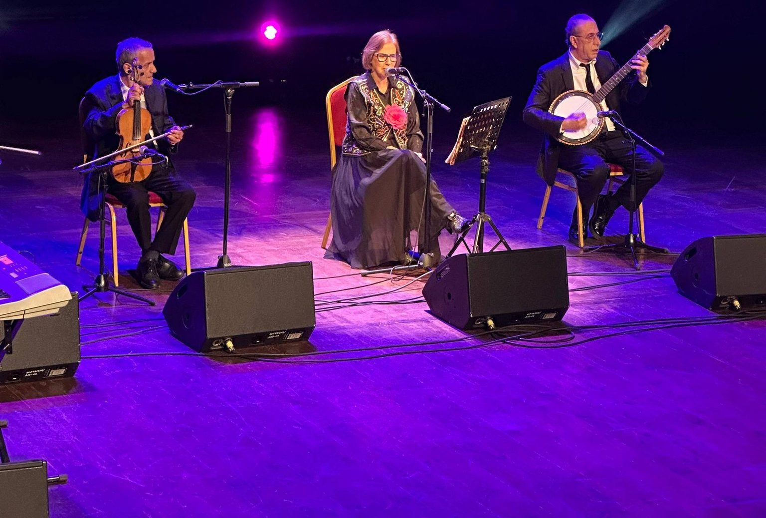Autour d’elle, un orchestre de musiciens chevronnés dont la complicité trahissait des années de scène partagée : Mohamed Said Belkhier au piano, Salim Bradaï et Djamel Kebladj aux violons altos, Krimou au banjo, Moulay Tidjani à la derbouka et Kamel Si Saber au tar. Un écrin sonore d’une précision et d’une sobriété remarquables, entièrement au service d’une voix « suave » dont la puissance tient moins au volume qu’à la profondeur du phrasé et à l’intelligence du texte. Car Zakia Kara Terki n’est pas venue au maqam andalou par hasard. Longtemps nourrie par l’école Ghernati de Tlemcen, elle s’installe à Alger en 1978 avec un objectif unique : maîtriser les contenus savants de l’école Senâa. Elle rejoint successivement les associations « El Djazaïria El Moussiliya » puis, en 1980, « El Fakhardjia », où elle a pour maître El Hadj Hamidou Djaïdir, figure tutélaire de la tradition algéroise disparue en 2004. En 1996, elle forme son propre orchestre et s’engage dans une carrière solo qui compte aujourd’hui sept opus couvrant l’ensemble des répertoires des écoles de Tlemcen et d’Alger. Un parcours d’une cohérence rare, entièrement consacré à la transmission et à l’approfondissement d’un patrimoine que peu osent aborder dans toute sa complexité.